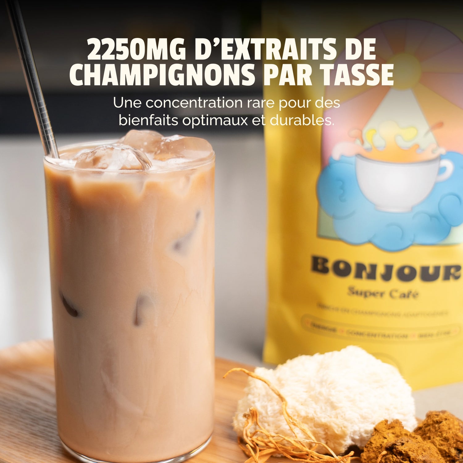 La force de Bonjour tient à sa concentration rare et puissante : 2 200 mg d’extraits de champignons adaptogènes biologiques par tasse, à l’origine de ses effets rapides et profonds.