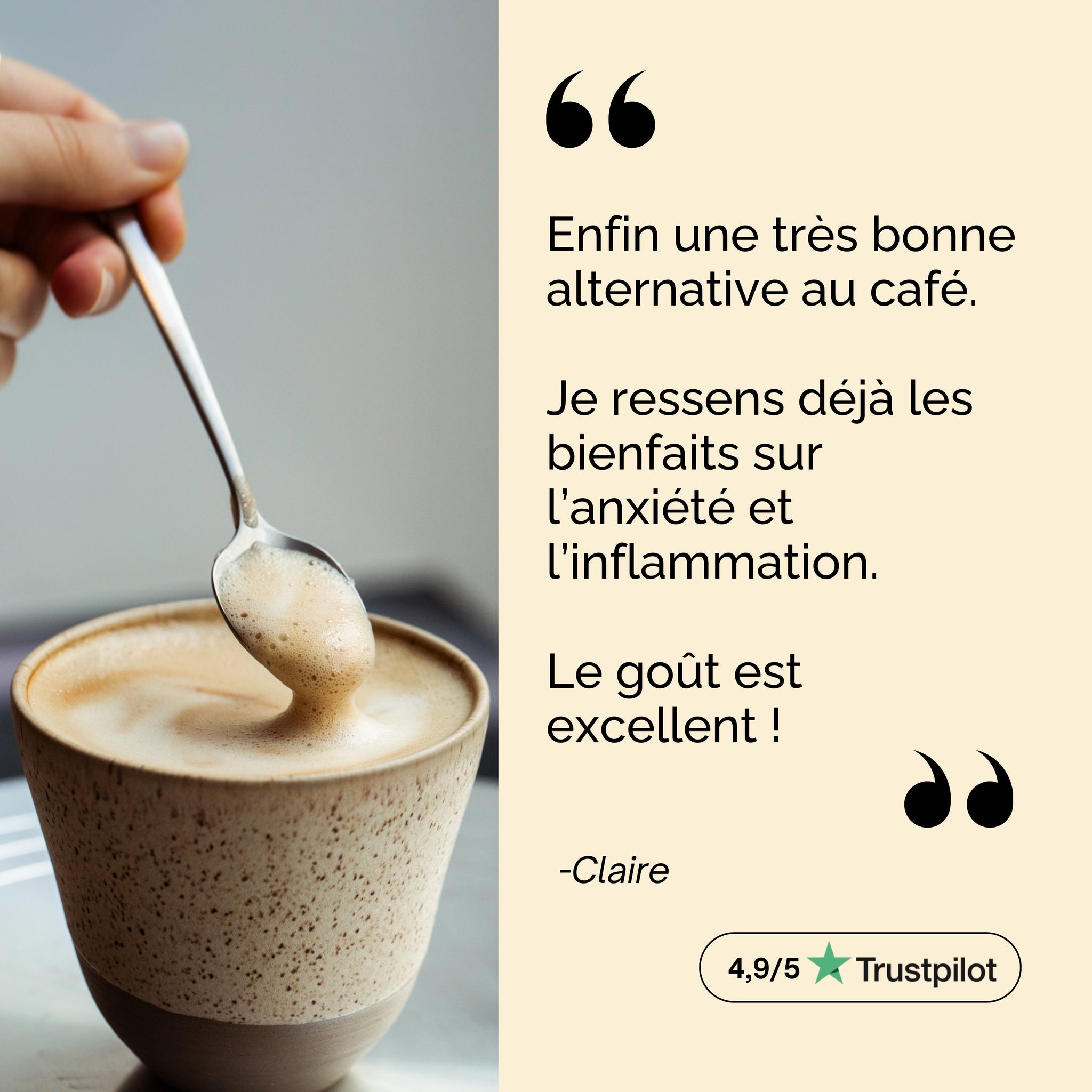 Chaque tasse contient 2250mg d'extraits de champignons biologiques (Lion’s Mane, Cordyceps et Chaga), soit plus de 40 % de sa composition — une concentration rare et hautement dosée pour une efficacité réelle.