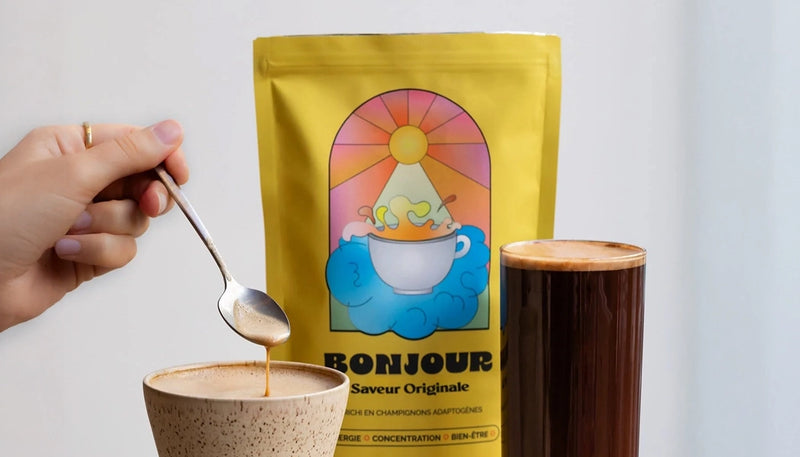 Bonjour est une formule unique, naturelle, sans gluten au goût irrésistible et élaborée à partir d'un mélange d'ingrédients naturels et d'extraits concentrés de champignons adaptogènes biologiques.
