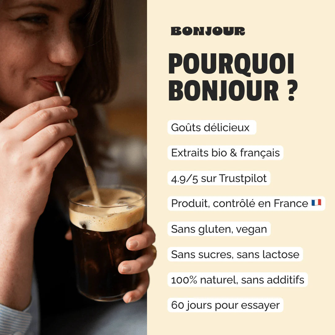 💫 Que vous souhaitiez remplacer ou simplement diminuer vos tasses de café ou de thé, ou instaurer un rituel gourmand qui fait du bien à votre corps et à votre esprit, Bonjour sera votre allié idéal.