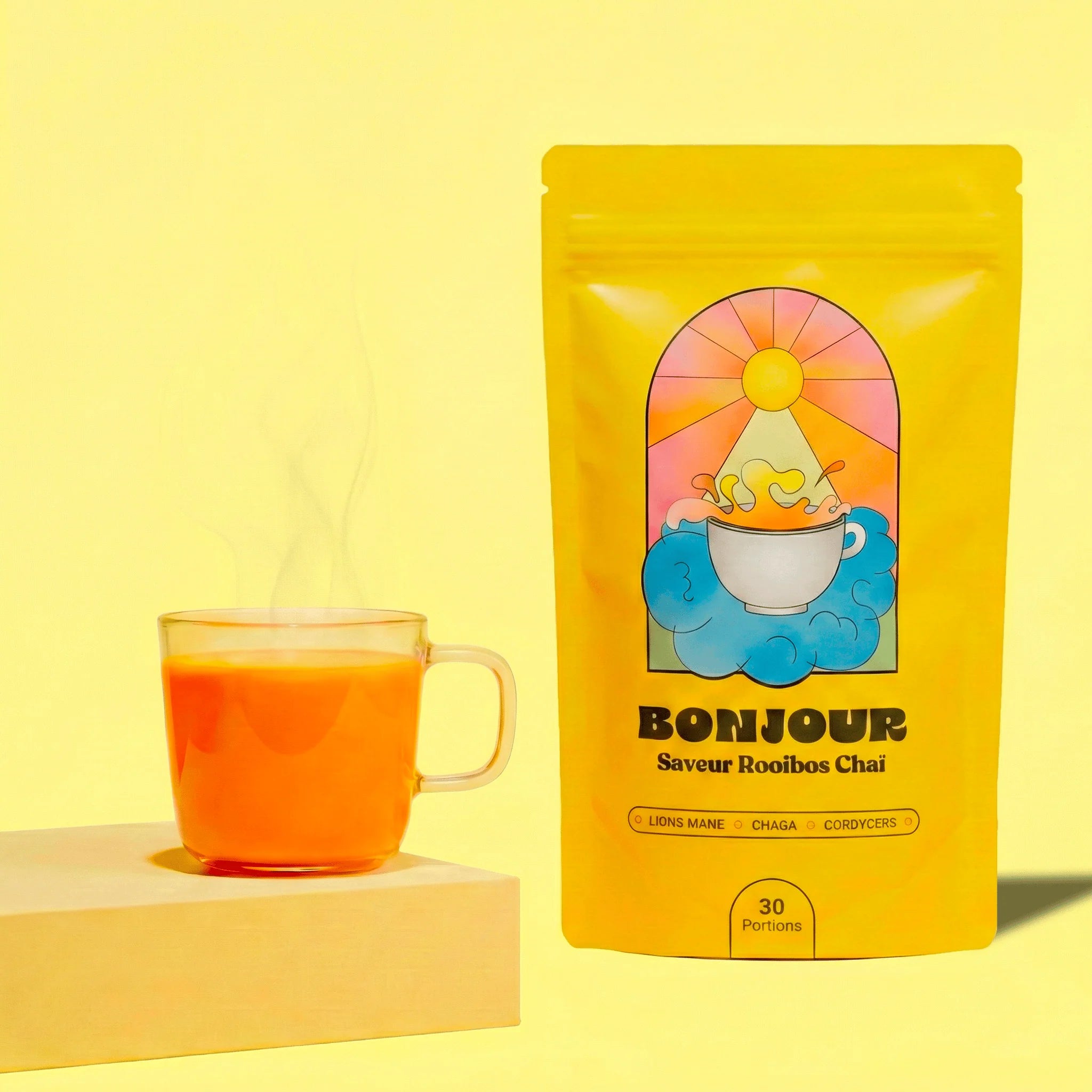 Ingrédients: Extrait de fleur de Camomille (Matricaria recutita L.), Extrait de fleur de Passiflore (Passiflora incarnata L.), Extrait de corps fructifère de Reishi, Extrait de feuille de Thé vert (Camellia sinensis L.), Poudre de curcuma (Curcuma longa), Poudre d'Anis vert (Pimpinella anisum).